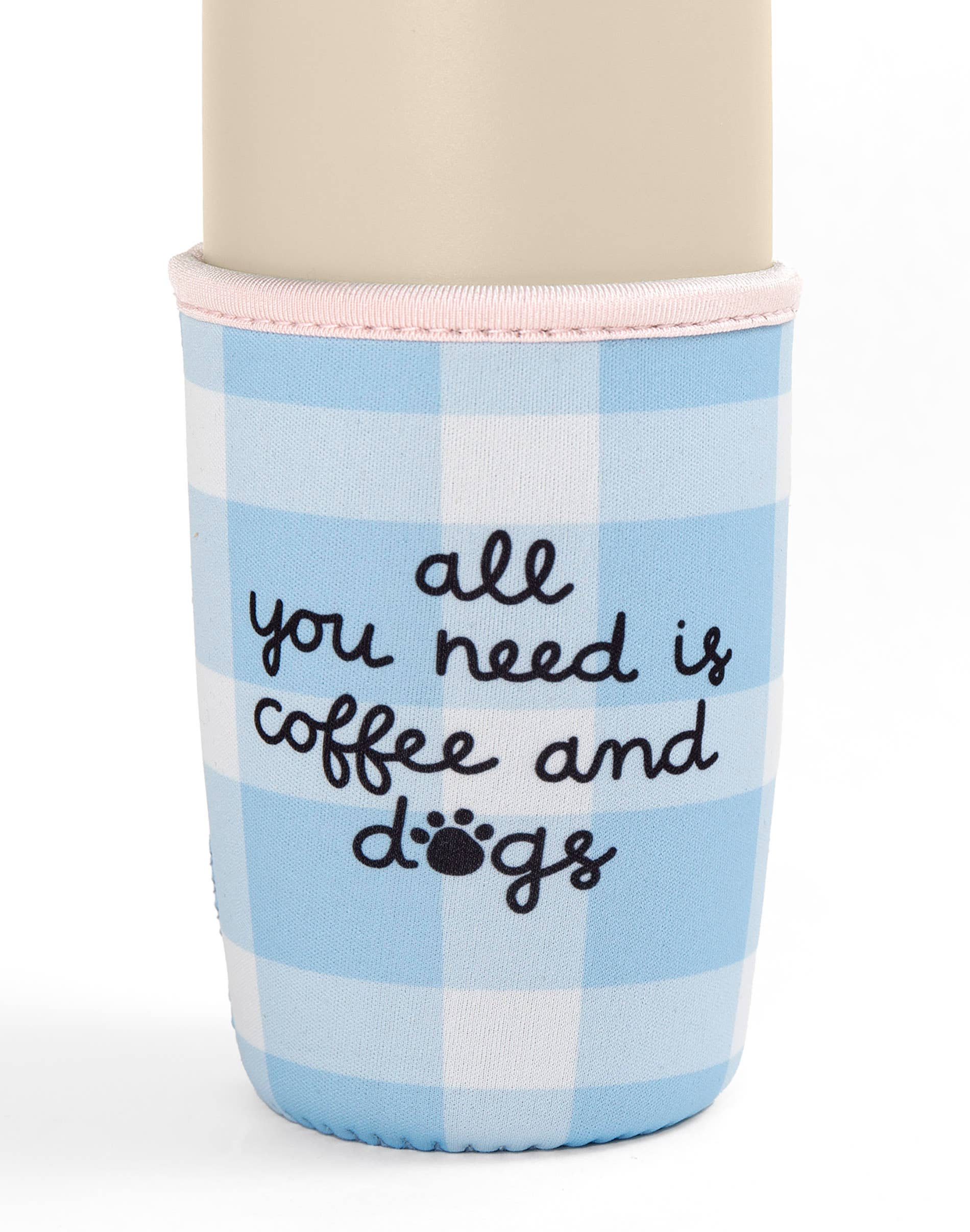 Keep your drinks cool and your hands warm with our Coffee & Dogs Coffee Sleeve! Featuring a fun blue gingham design and the hand-lettered phrase 'all you need is coffee and dogs,' this sleeve is perfect for any dog lover or pet parent. It's ideal for iced coffees, teas, and other beverages. Great as a gift for friends, family, or yourself, this coffee sleeve adds a touch of canine charm to your daily routine. • Features: Small fits a 16-18oz cup; Medium fits a 22-24oz cup • Material: Neoprene •