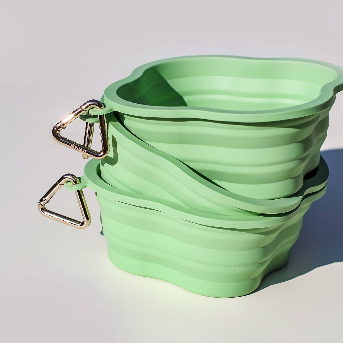 Portable, collapsible bowl includes a gold triangle carabiner clasp that clips onto any leash, tote bag or backpack. Folds flat for efficient storage and travel.