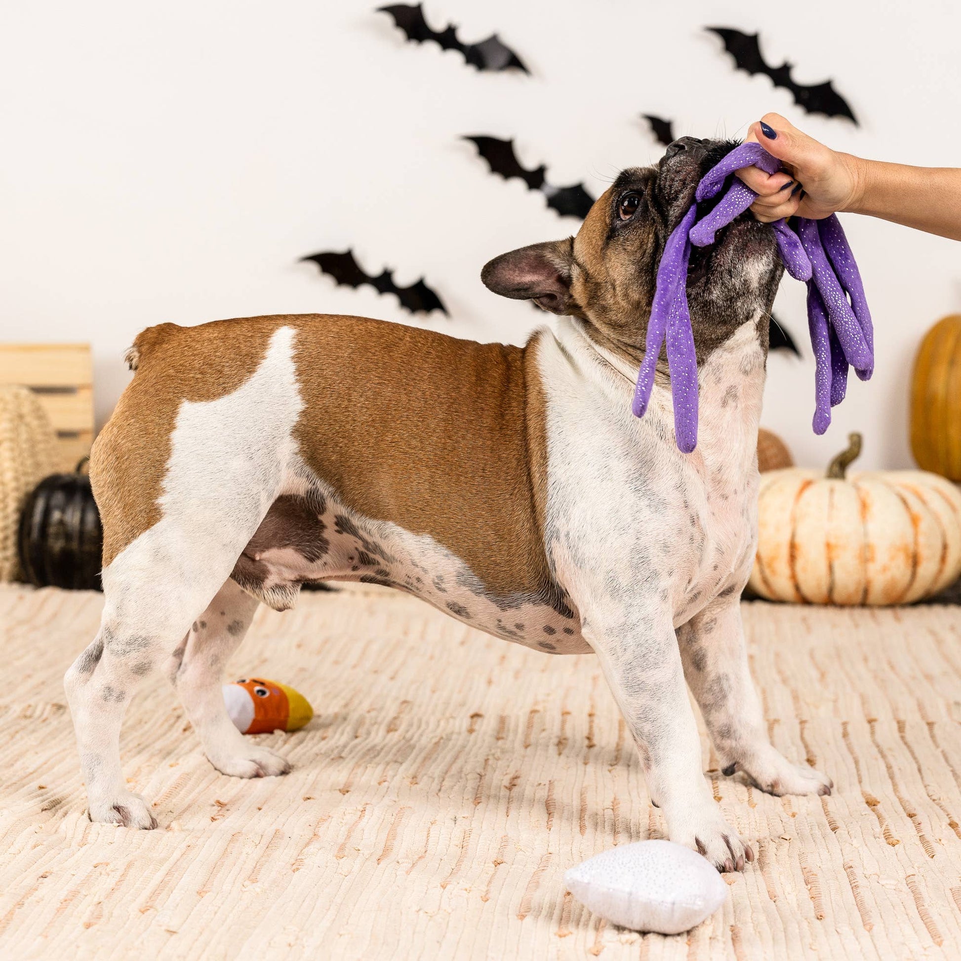 A fun fright fest! Made with a loud squeaker in each toy and crazy crinkle paper in each toy, these creepy creatures are a frightening good time. Great for all-sized dogs and not intended for aggressive chewers.SPIDER: 8" x 16" x 3" GHOST: 4" x 4" CANDY CORN: 4" x 3.25"
