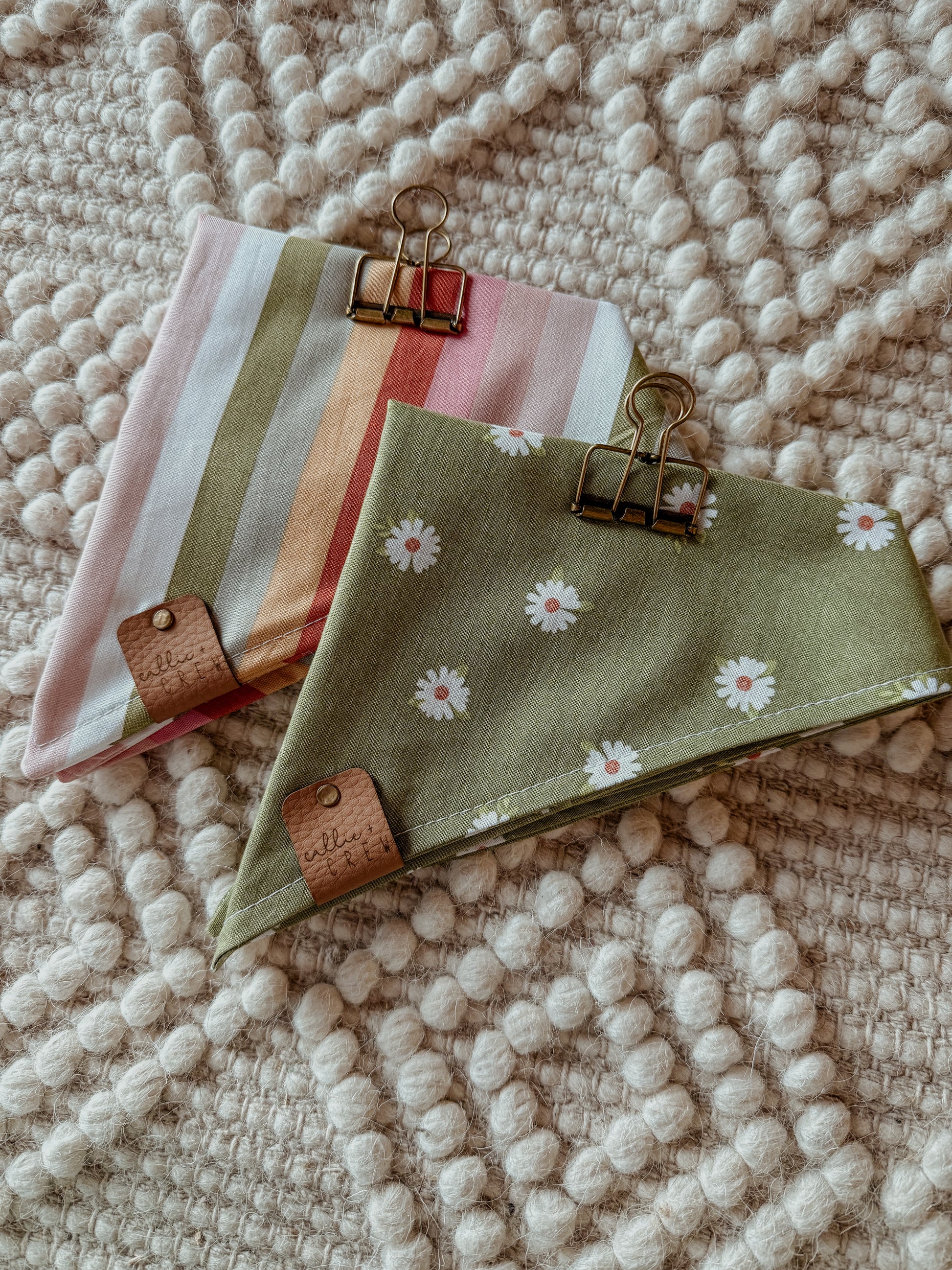 Our handmade bandanas come in 4 different sizes for all pups! Please note that sizing varies due to bandanas being handmade. If you are are having a hard time choosing a size, we recommend that you select the large size!