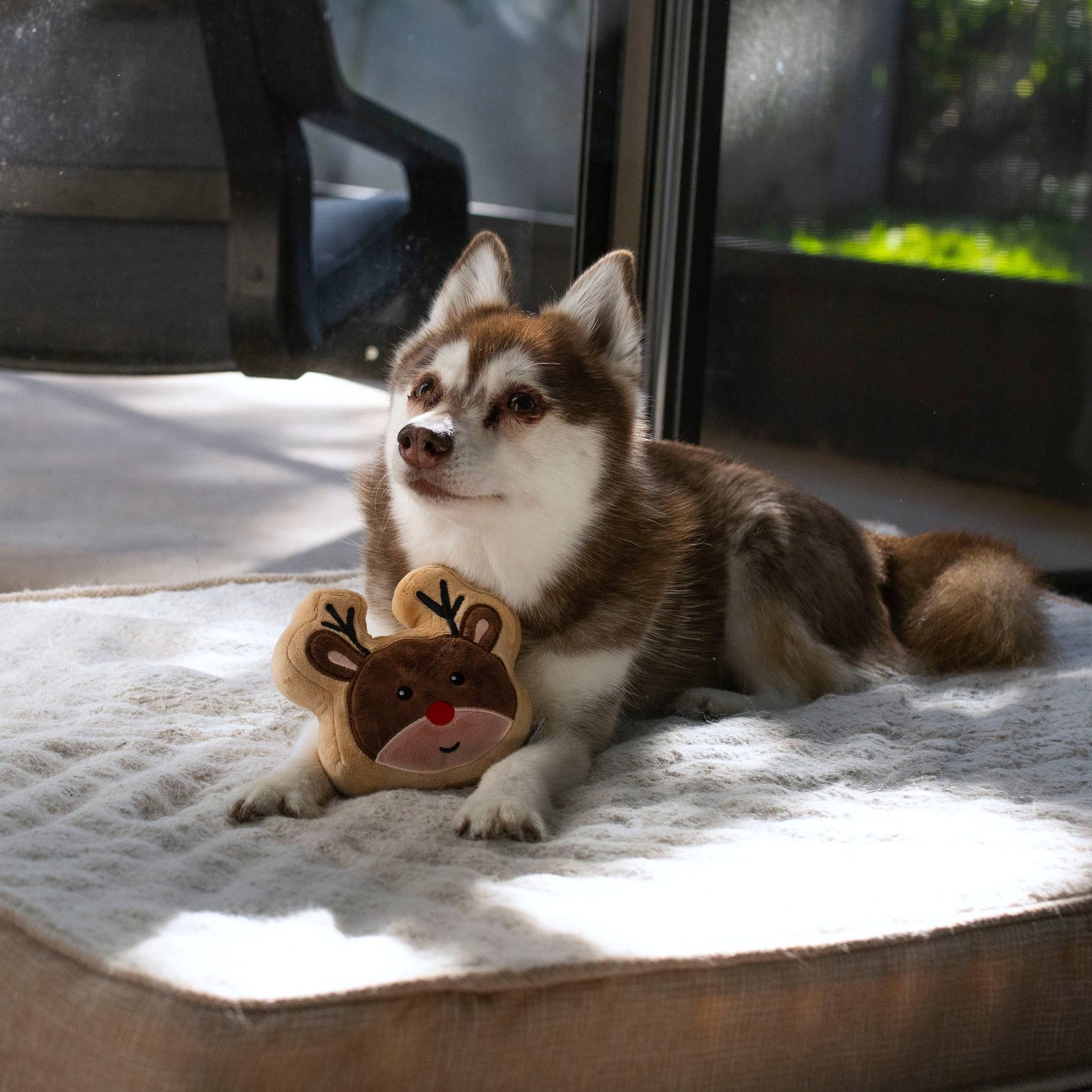 These reindeer cookies measure 5" x 5". Celebrate the holidays with these adorable sugar cookie plush toys! Each toy includes a squeaker for added enjoyment. These toys are designed to resemble your favorite Christmas tradition, decorating sugar cookies! These plush toys are dog friendly, in a form they will love (plush & squeaky)! If your dog loves plush toys, these are the ones for them! IS NOT A SET ONLY COMES AS 1!